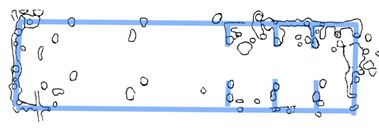Abb. 1: Groß Fredenbeck FStNr. 15. Grundriss des Langhauses. Zur Verdeutlichung ist der Wandverlauf blau gekennzeichnet. Das Haus war etwa 21×5,5 m groß