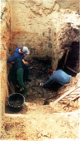 Abb. 2: Groß Fredenbeck FStNr. 15. Schwierige Verhältnisse: Der halbe Brunnen ist abgetragen, rechts im Bild zeigt sich die Fredenbecker Holzleiter.